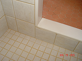 | Ceramic Tiles 6 x 6 inch, 4 x 4 inch, 2 x 2 inch diamonds, 13 x 13 inch borders with combination of ceramic tile pieces and limestone tile pieces were used to create this design. 2 x 2 inch porcelain tiles installed on cement sub-floor. 4 x 36 inch Marble pieces installed in the shower doorway (4 sides). Note: Tiles installed outside of the shower were installed by the other contractors many years ago. |